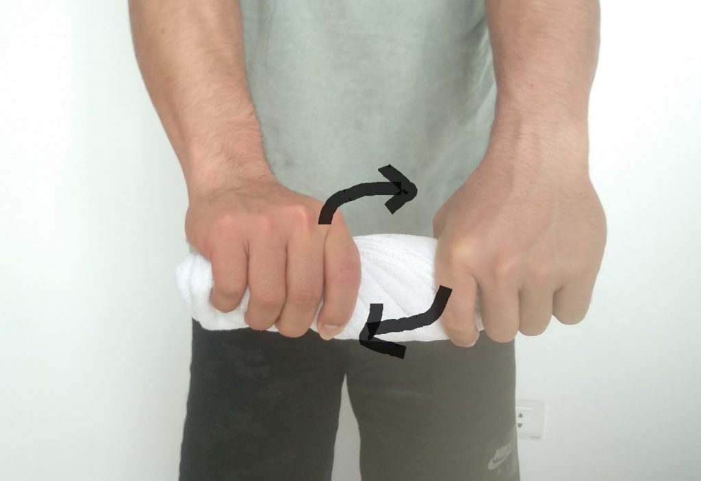 | 2. Xoắn vặn hai tay: Dùng hai bàn tay nắm giữ một chiếc khăn tắm cuộn lại rồi xoắn vặn khăn với hai bàn tay theo hai hướng trái ngược nhau đến mức tối đa. Giữ hai tay ở vị trí đó trong 05 giây, sau đó thư giãn vài giây rồi làm lại như vậy 10 lần. Mỗi ngày tập 02 đến 03 lần |